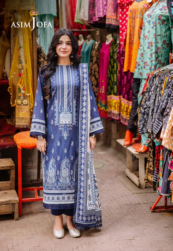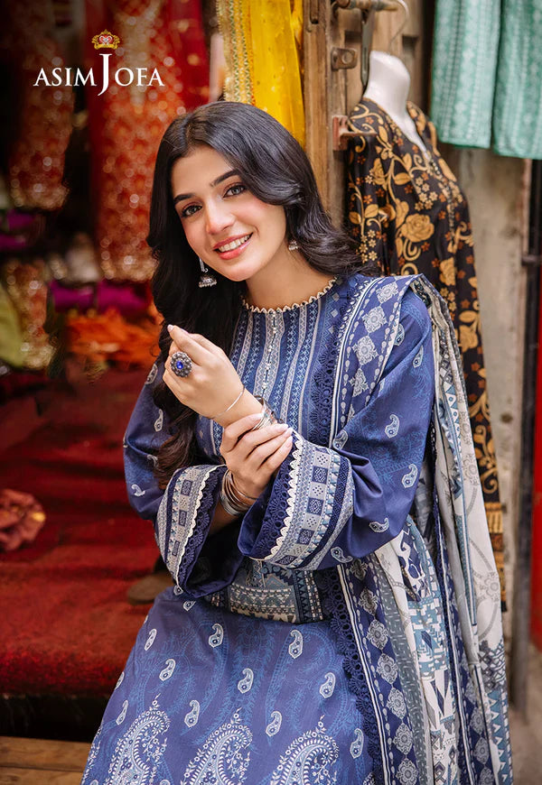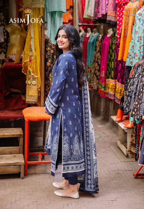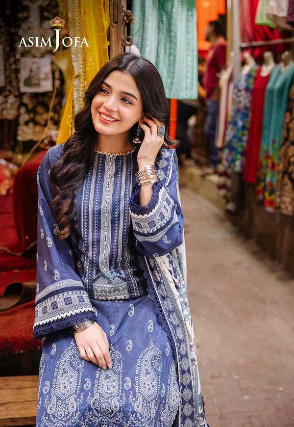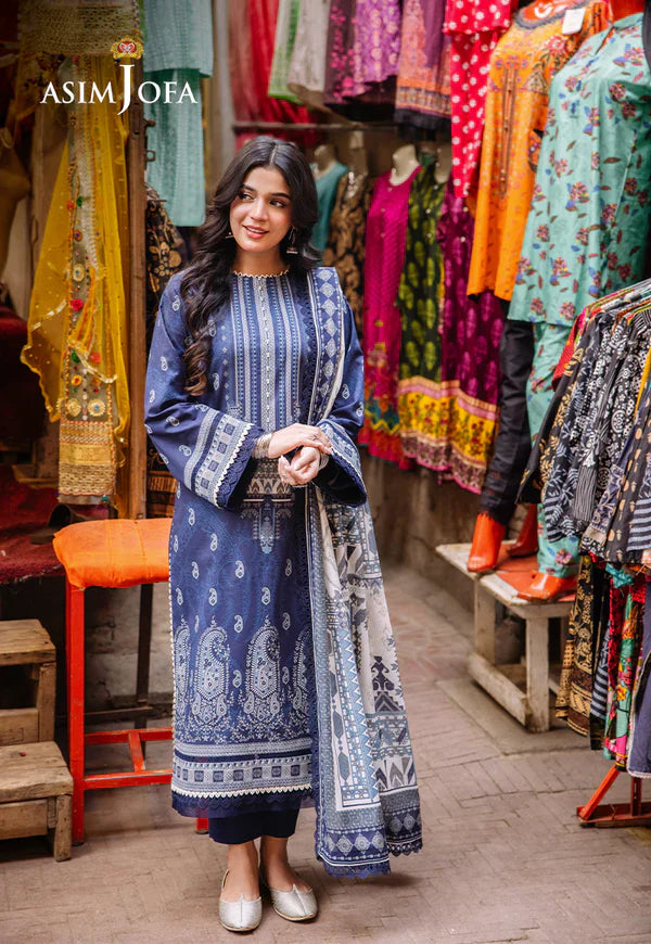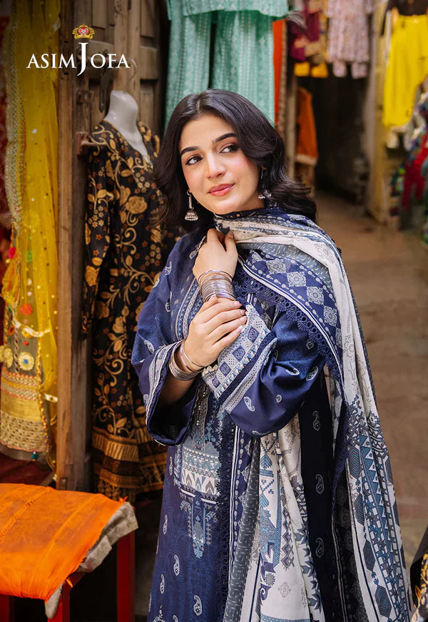 Wrap yourself in the mystery of the sky with this navy blue ensemble from Asim Jofa’s Basic Print Collection. The lawn shirt is adorned with white intricate motifs which is reminiscent of the finely crafted jewelry. The dupatta captures the laughter and music that fills the air making every moment a celebration of boundless fashion and grace.