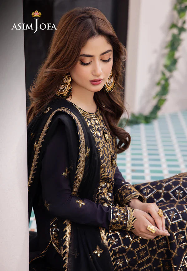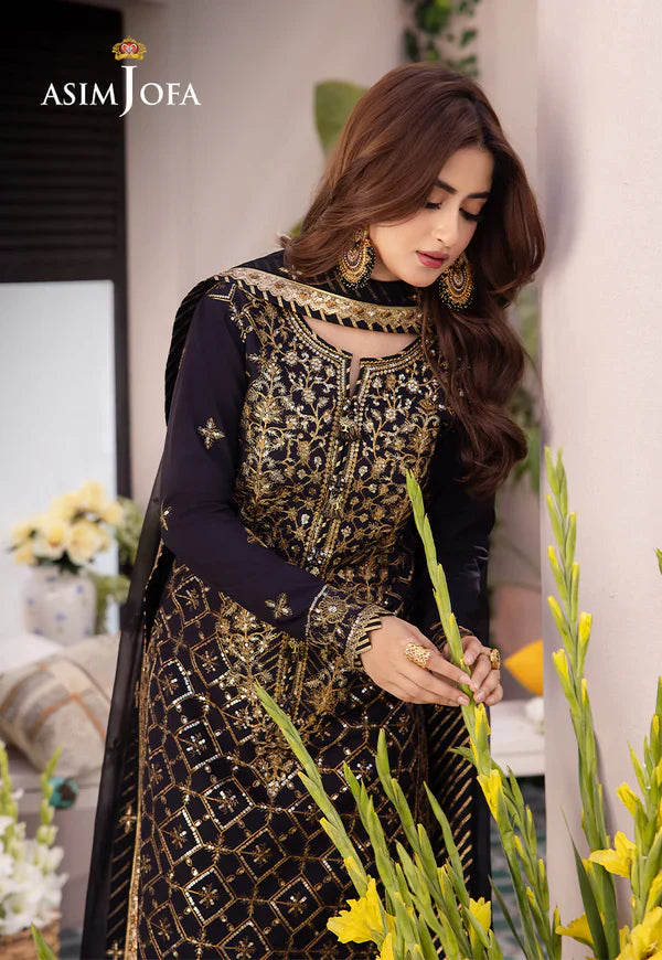 This design boasts a stunning geometric embroidery pattern all over the shirt rendered in antique gold zari & blingy sequins. It is adorned by a heavy neckline & hem border, breaking the monotony of the running design. It comes with an embroidered chiffon dupatta & dyed pants.