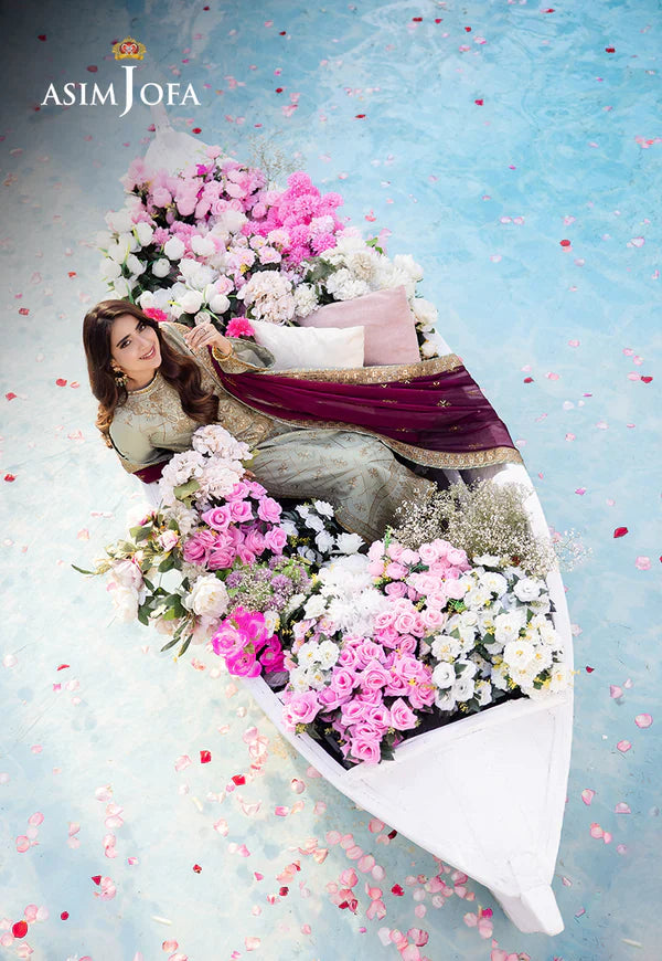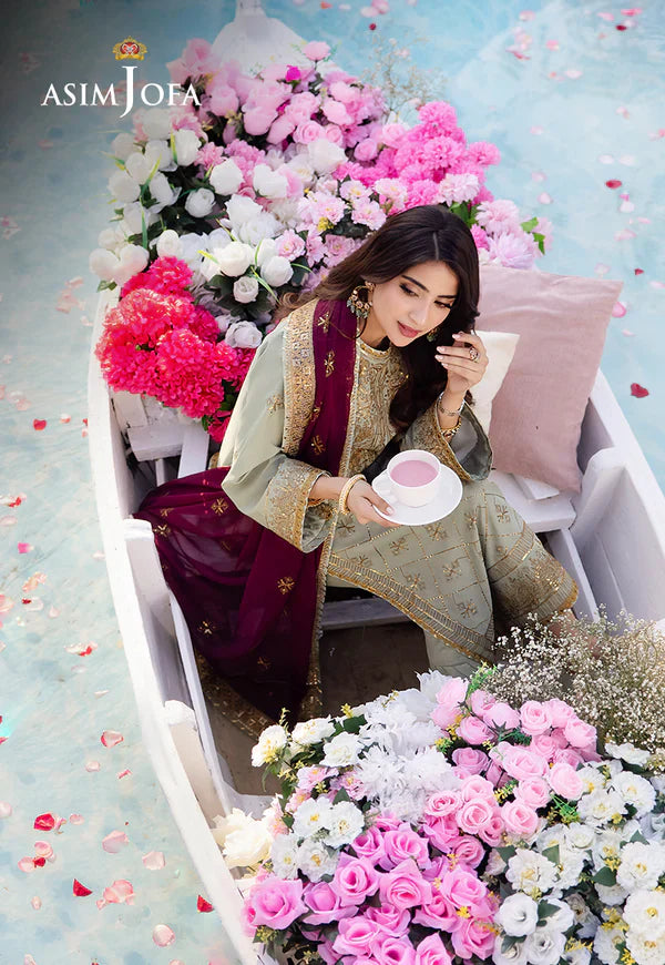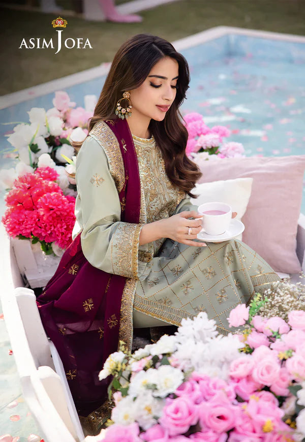 Saboor Aly is an epitome of serene calm dressed in this soothing sage green ensemble, embellished with a combination of geometric & floral patterns etched in dual-toned golden zari & sequins lending it a beautiful shine. The shirt is complemented by a magenta chiffon embroidered dupatta which comes as a fitting contrast to this pastel shade.