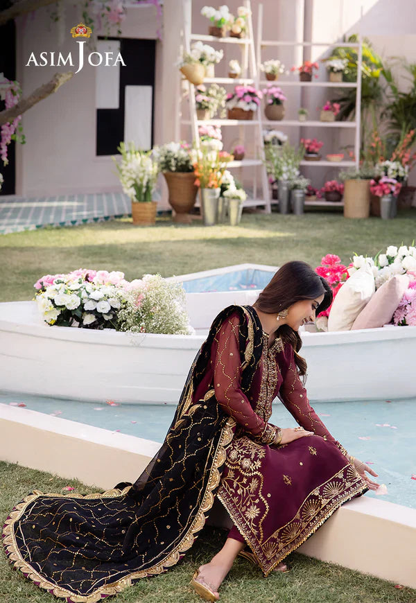 Saboor Aly carries this stylish design with panache. A sleek silhouette with bold embroidery side patches & neckline pasted on an allover pattern made in two toned gold zari & sequins looks beautiful on the contrast of maroon & black. For those who like statement pieces in their wardrobe this design is a must have.