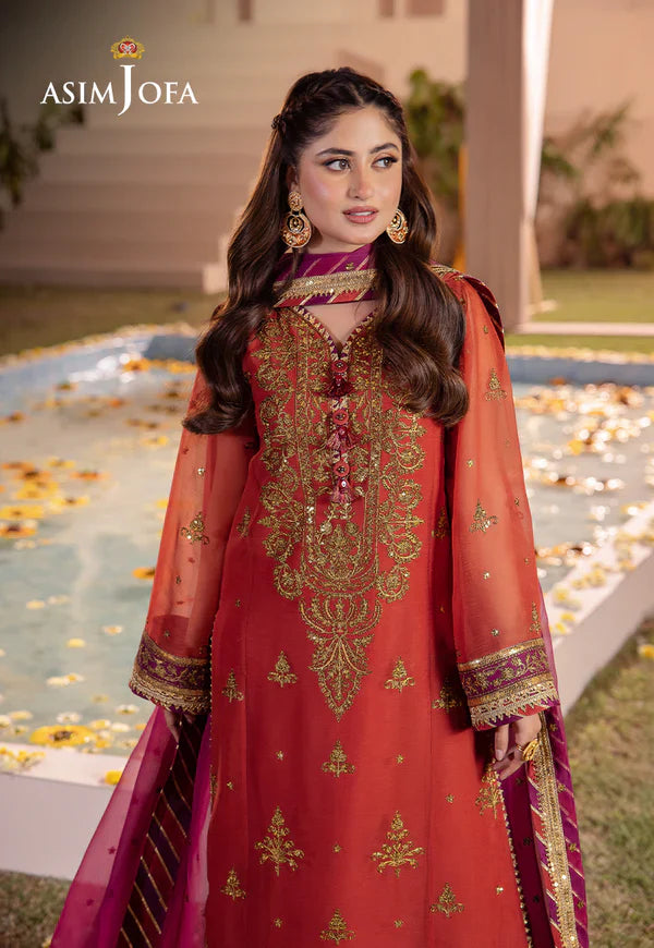 Sajal Aly oozes grace in this captivating design. Shimmery spangles dazzle on rust chiffon base. A straight silhouette is rendered with delicate zari work & spangles ending in a heavy contrast purple border along the hemline replicated in sleeves. It comes with an embroidered chiffon dupatta & dyed trouser.