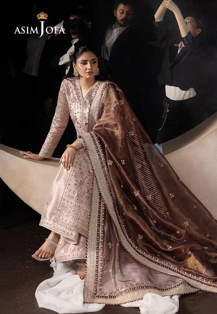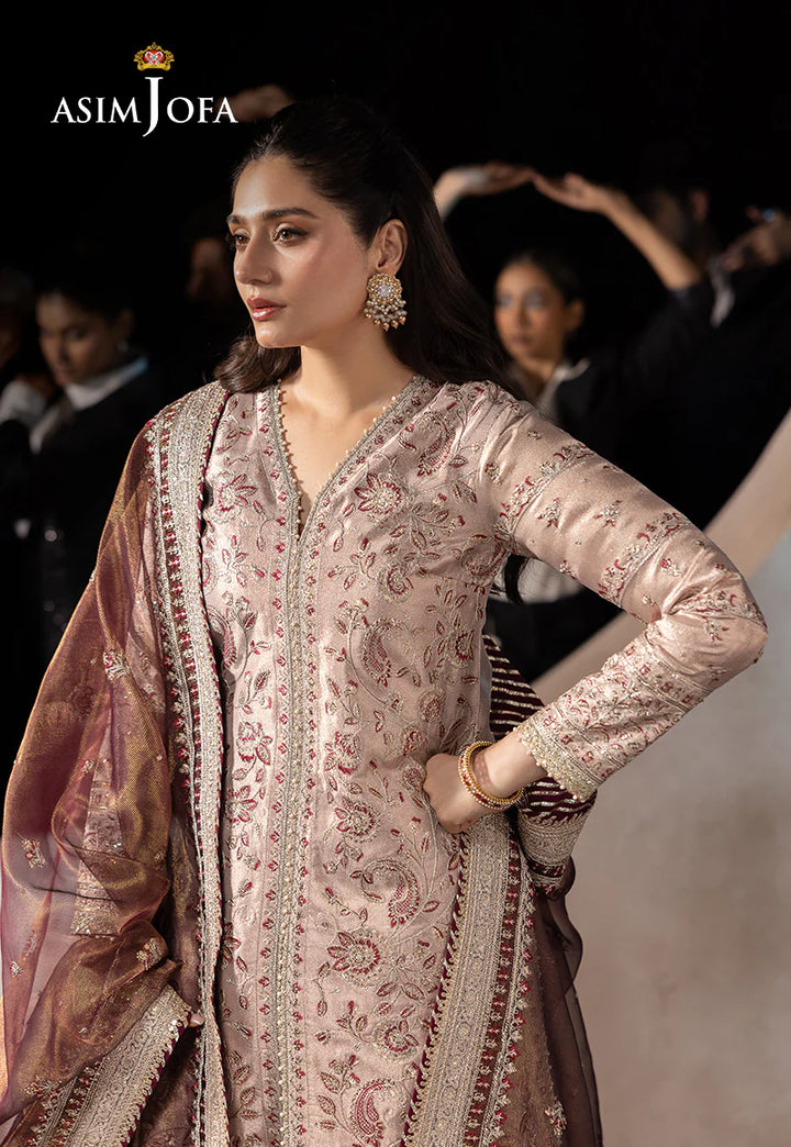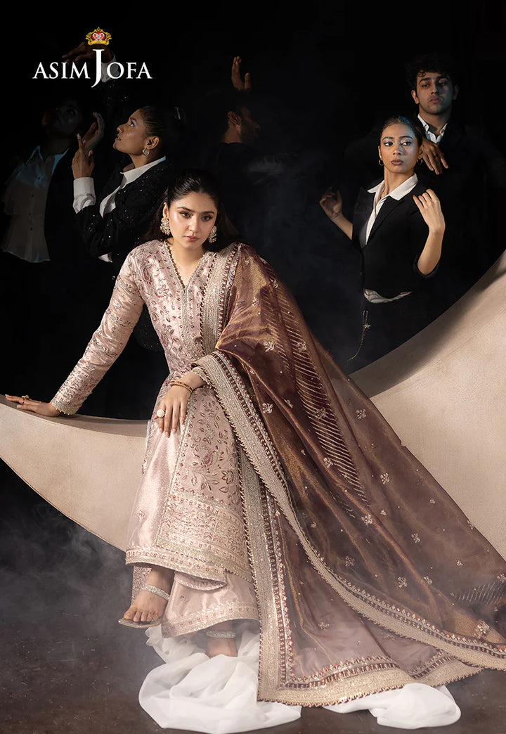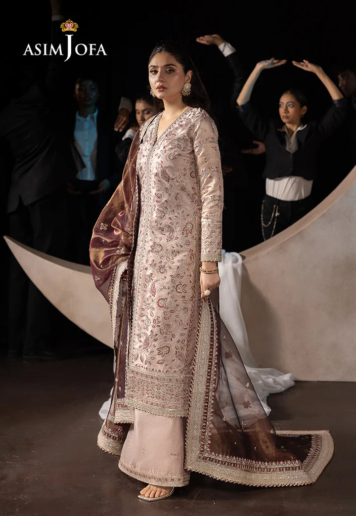Soft as a whispered promise, this blush pink ensemble blends grace with subtle drama. The fully embroidered shirt, crafted in an elegant front open style, glows with champagne zari and sequins that add a gentle luster to every thread. Maroon threadwork winds its way through the embroidery like delicate vines climbing a garden wall, adding depth and contrast to the pastel canvas. Paired with a minimally embroidered trouser for a refined balance and a contrasting deep maroon dupatta that anchors the look with richness, this ensemble is an ode to poised femininity and timeless beauty.