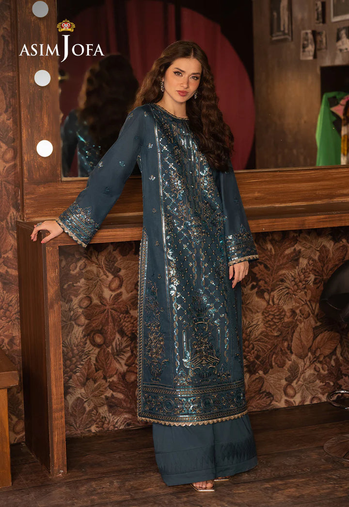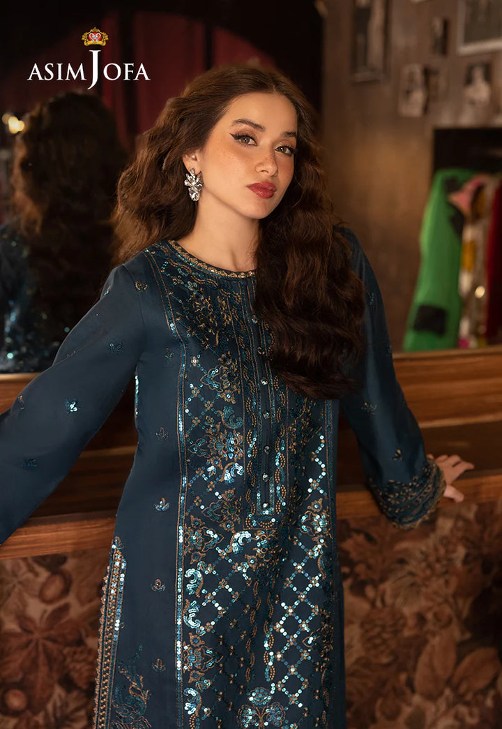 In a captivating shade of teal, this ensemble is a portrait of artistic finesse. The shirt is adorned with gorgeous embroidery featuring light gold zari that glistens with every thread, while 5mm blue sequins catch the light, adding a delicate shimmer to the design. Each detail is thoughtfully placed, creating a refined visual rhythm that feels both luxurious and contemporary. A statement of elegance and creativity, this ensemble is made for moments where style meets subtle brilliance.