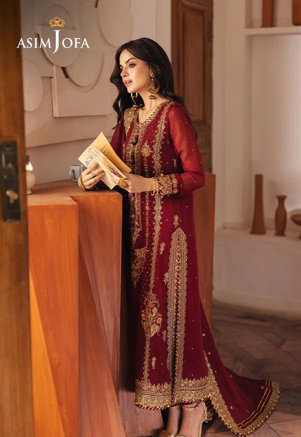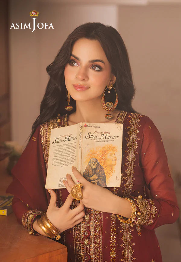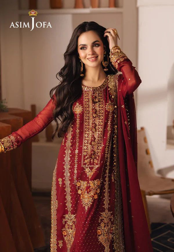 Drenched in the richness of deep red, this captivating ensemble is a testament to timeless elegance. The shirt is adorned with intricate rust threadwork that weaves tales of passion and artistry. Gold zari detailing adds a regal touch, shimmering like molten sunlight, while gold sequins scatter across the design, catching the light like radiant embers. The ensemble is completed with a gracefully embroidered chiffon dupatta, enhancing its allure and transforming it into a true statement of sophistication and charm.