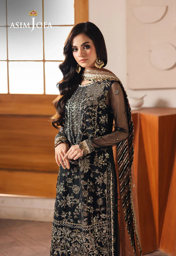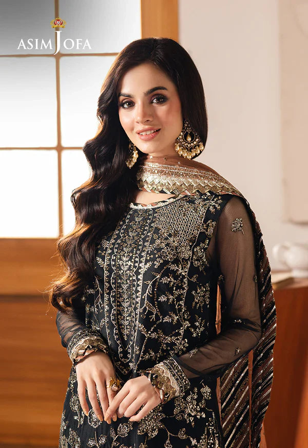 A symphony of contrasts, this black ensemble is adorned with intricate black and taupe threadwork, creating a refined interplay of textures. Light gold zari and two-toned mink zari flow harmoniously, crafting a masterpiece of rich detailing. Scattered with luminous light gold sequins, this ensemble is paired with an embroidered dupatta, embodying bold elegance with a touch of artistry.