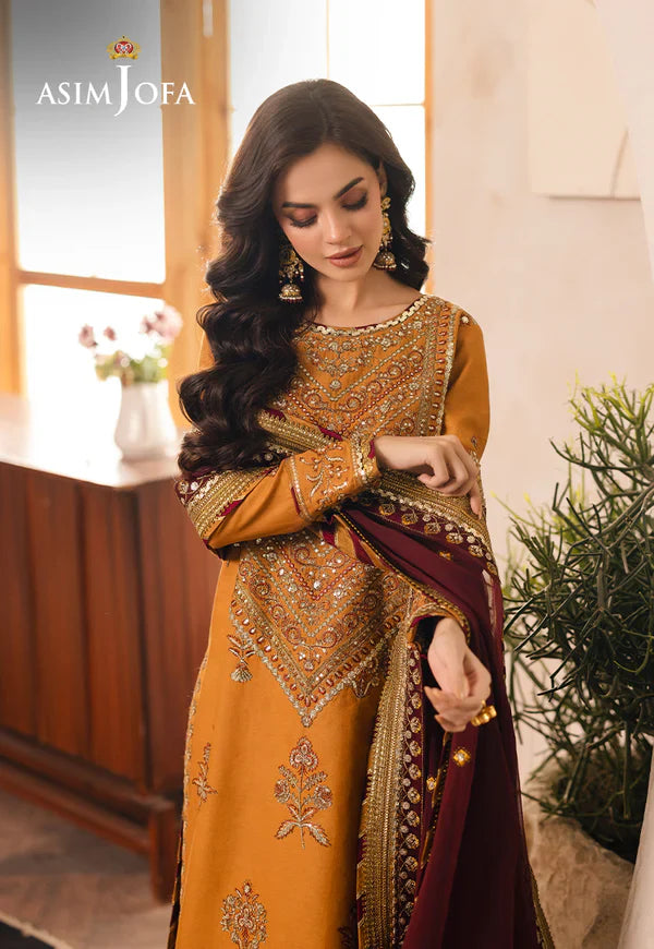 Vibrant and regal, this mustard ensemble shines with two-toned gold zari detailing, adding layers of depth and radiance. Accentuated by maroon threadwork, the design achieves a striking contrast that captures attention. Finished with shimmering 5mm gold sequins and an embroidered chiffon dupatta, this outfit celebrates bold elegance with a hint of traditional charm.