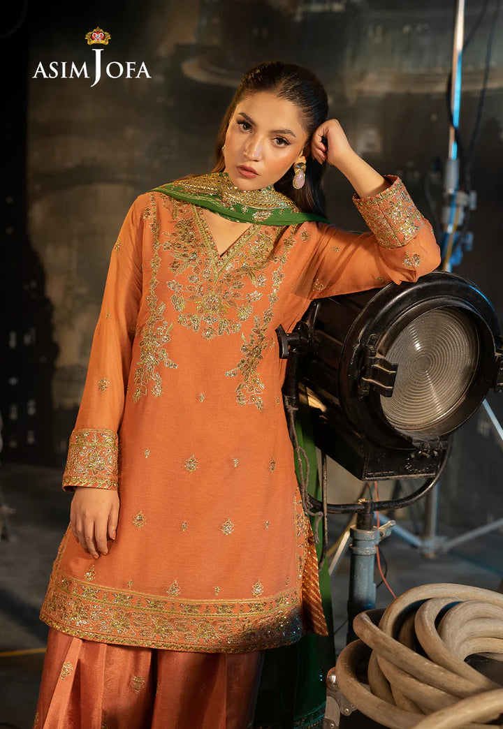 Bathed in the soft glow of coral peach, this ensemble presents a vision of refined elegance. The short shirt is beautifully embroidered with light gold zari and sequins, interwoven with coral and verdant green threads, creating a subtle yet captivating shimmer. Paired with the season's coveted Farshi shalwar, its minimalist embroidery offering a sophisticated counterpoint, the ensemble achieves a harmonious balance of detail and simplicity. The embroidered dupatta in a contrasting hue, injects a vibrant edge, transforming this ensemble into a statement of contemporary grace.