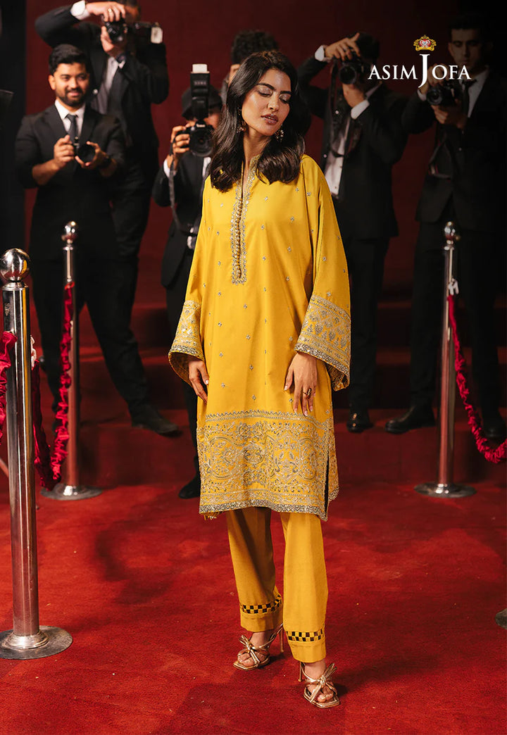 Sunlit yellow, a beacon of cheerful elegance, illuminates this contemporary ensemble. The boxy cut shirt, crafted with an artistic expression, is meticulously embroidered with light gold sequins and zari work, interwoven with subtle beige threadwork. The design culminates in a striking, heavily embroidered border, adding a touch of opulent detail. The wide, styled sleeves, each featuring their own embroidered border, further enhance the shirt's modern silhouette and luxurious feel. Paired with trousers, this ensemble achieves a harmonious balance of bold design, making it a statement piece for any occasion.