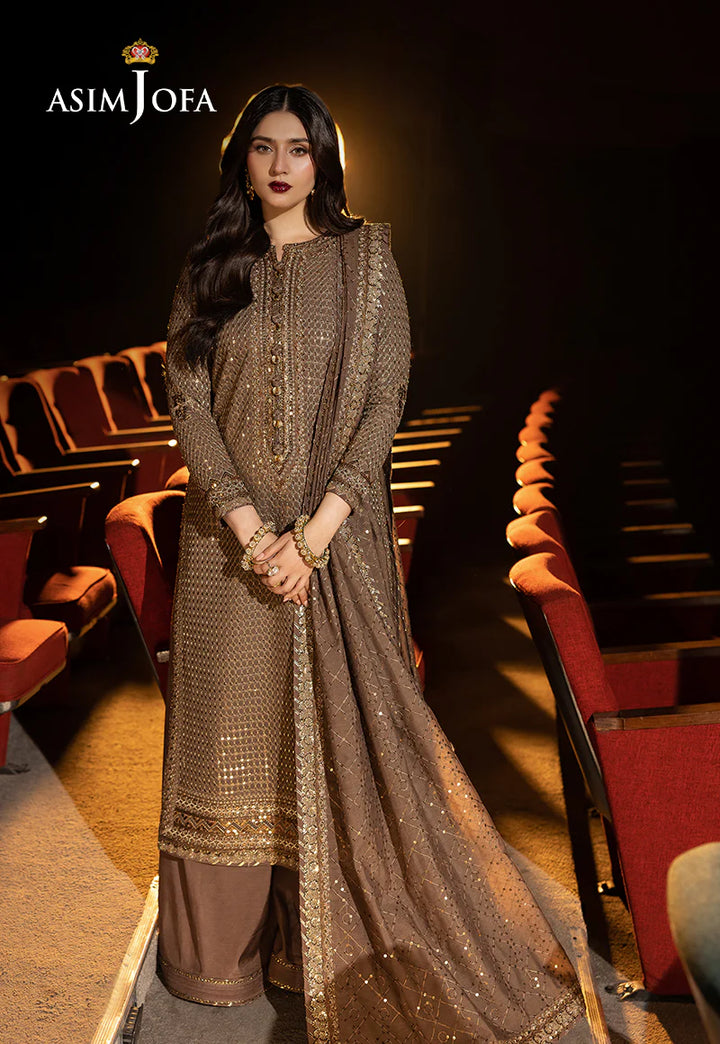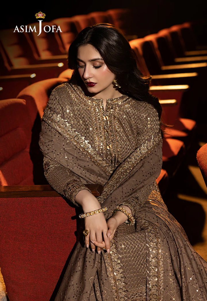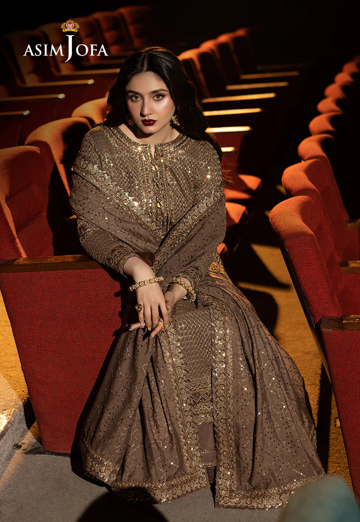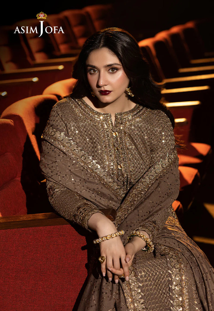 A sequined brilliance wrapped in warm earthy tones, this brown ensemble exudes an aura of refined glamour. The shirt glistens with light gold zari and radiant 5mm sequins that shimmer like sunlit amber, while coffee brown threadwork weaves through the fabric like soft shadows on polished wood. The richness of the design is elevated with a heavily embroidered dupatta, adding depth and grandeur to the look. This ensemble is a perfect blend of subtle luxury and bold expression—crafted for celebrations where every detail matters.