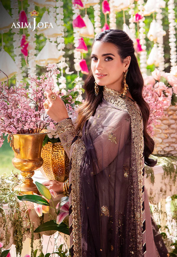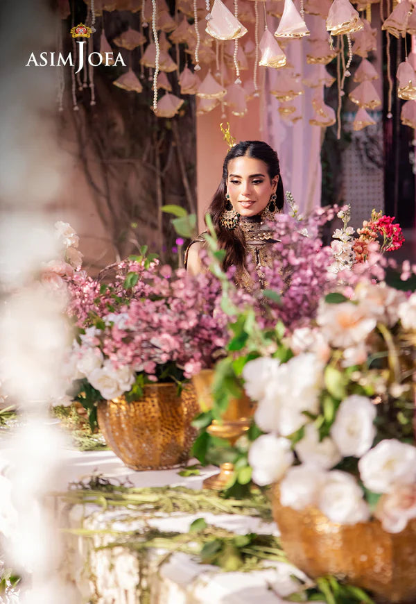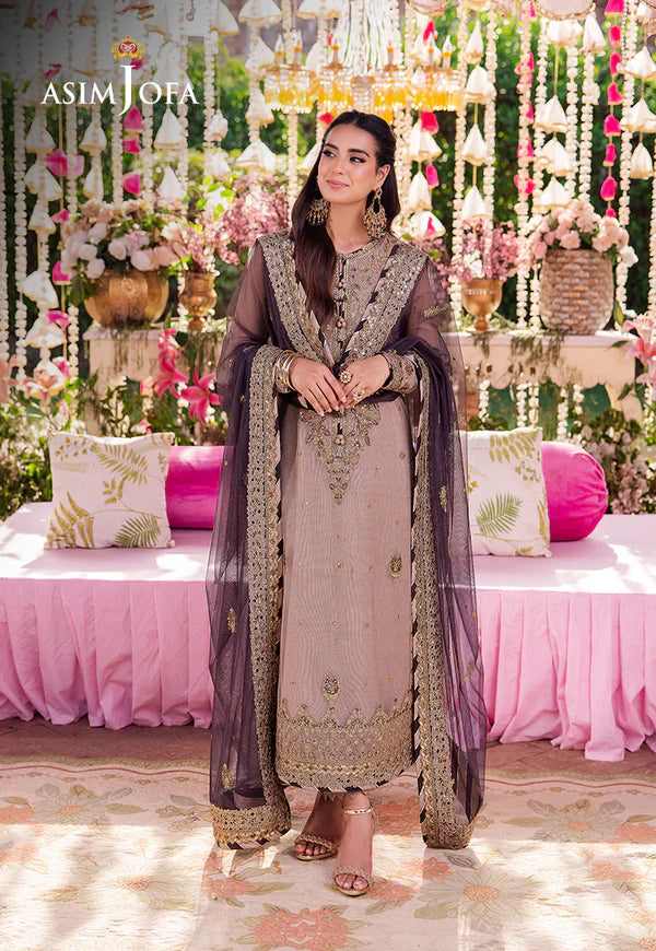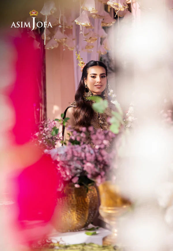 Asim Jofa’s “Jag Mag Collection” introduces this ensemble, a celebration of opulence and grace. The shirt is a serene beige hue and features a gorgeous neckline and borders meticulously adorned with shimmering gold zari and delicate sequins. The motifs dance across the fabric evokes timeless elegance. Complementing this regal piece with a brown dupatta which is embroidered to perfection. Whether it’s a daytime festivity or an evening soirée, grace this outfit and stay radiant.