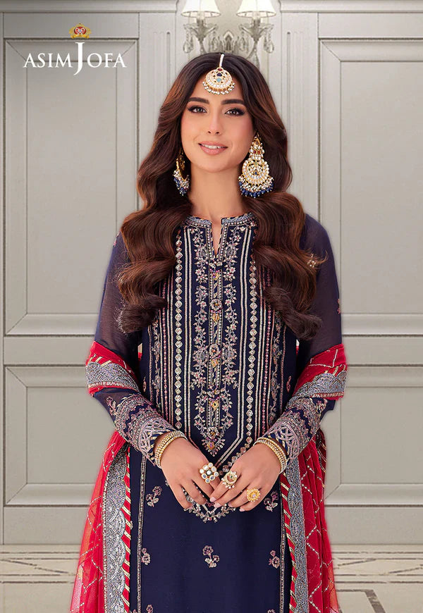 Step into the limelight with “Jag Mag Collection” by Asim Jofa. This navy-blue masterpiece is a testament to the grandeur of celebrations adorned with a majestic floral border that blooms in the hues of reddish-pink, gray, and dull mauve threadwork. The light gold sequins and zari embroidery weave a narrative of opulence while the reddish-pink dupatta embroidered on both sides adds a vibrant dimension to this luxurious ensemble. Embodying the spirit of the collection, this outfit promises to keep you radiant from dawn’s subtle glow to dusk’s vibrant hue.
