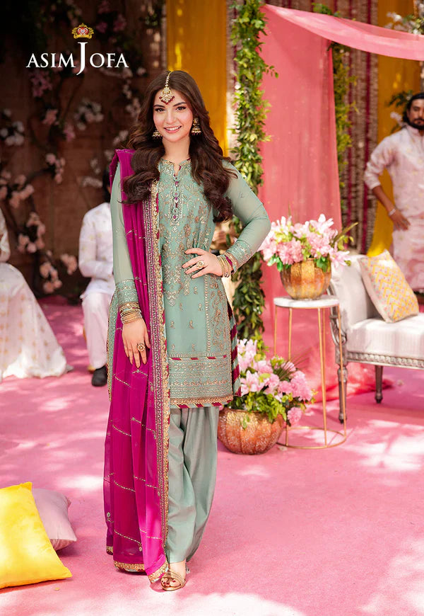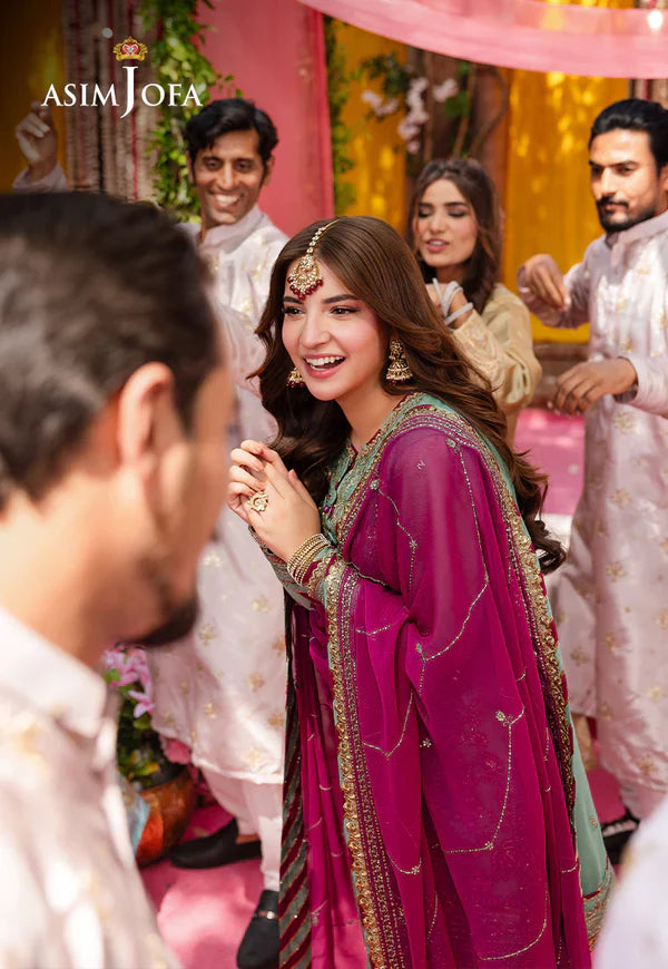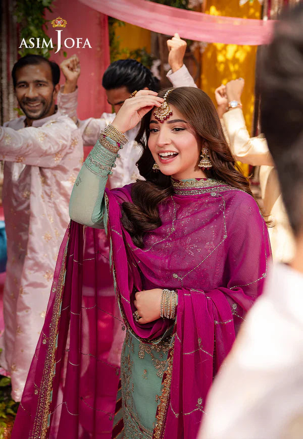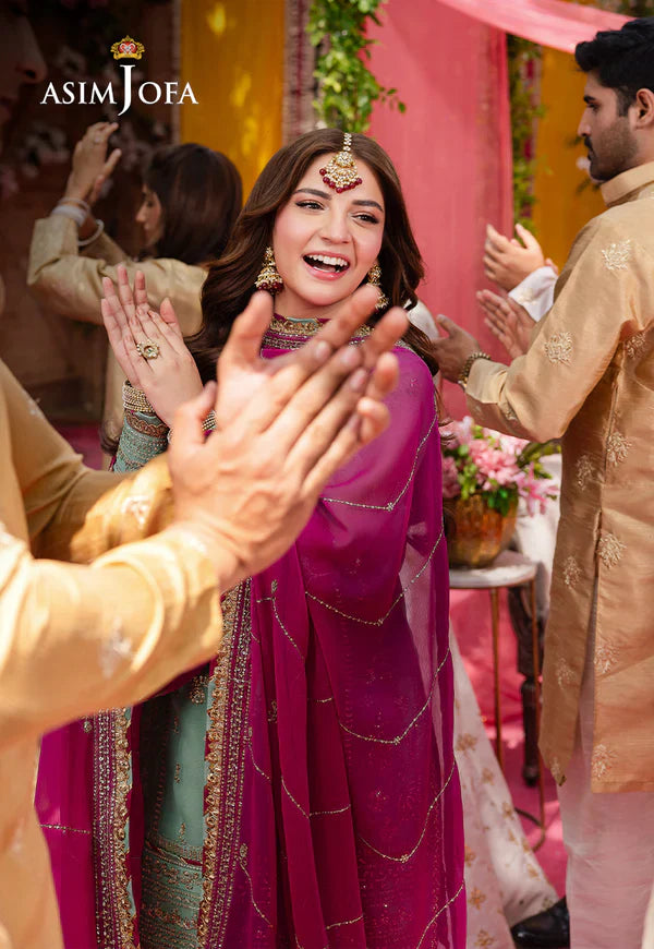 Asim Jofa’s “Jag Mag Collection” brings forth the fusion of sage green serenity and magenta vibrancy. This outfit is a canvas of tradition embroidered with antique gold two-toned zari and 3mm gold sequins that capture the essence of desi charm. The magenta dupatta with its two-sided embroidery adds a pop of color making this ensemble a perfect blend of elegance and celebration.