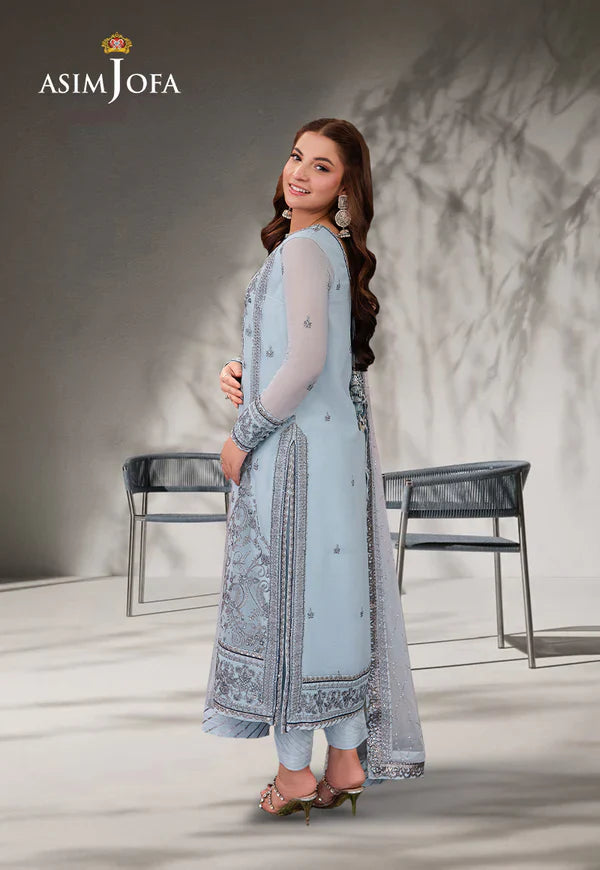Asim Jofa invites you to bask in the glow of the “Jag Mag Collection” with an ice-blue ensemble that speaks volumes of festive elegance. Adorned with a symphony of silver zariwork in dual tones and sprinkled with light gold sequins, this outfit captures the essence of joyous moments. The shirt is a tapestry of grey and teal threads intricately forming motifs that resonate with both modernity and tradition with stunning borders. Accompanied by an embroidered dupatta, this ensemble is your ticket to shining bright at every celebratory event.