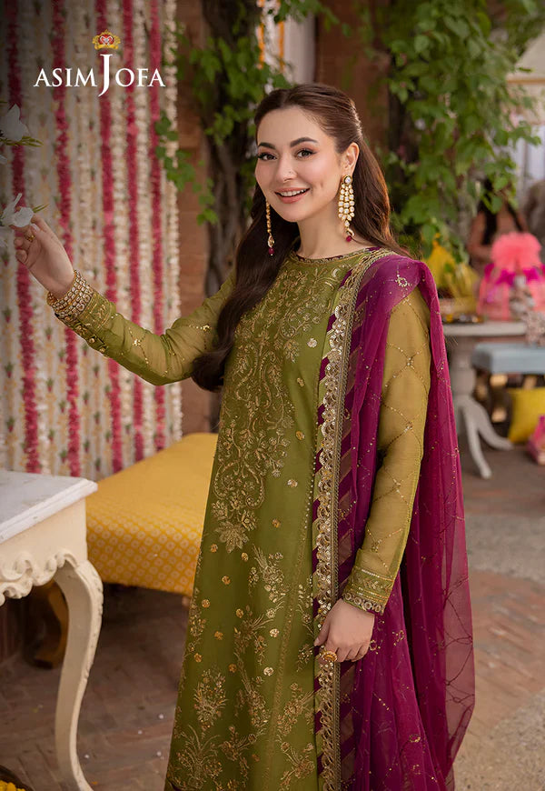 Embrace the essence of sophistication with this fern green outfit from “Jag Mag Collection”. Intricately adorned with antique gold two-toned zari and shimmering gold sequins, the traditional rhythmic patterns create a symphony of elegance. From neckline to borders, this shirt is a testament to opulence while the matching dupatta embroidered to perfection completes this luminous ensemble. Perfect for both daytime festivities and evening soirées!