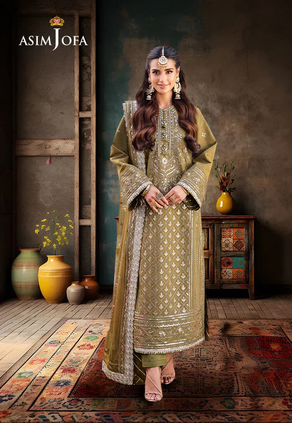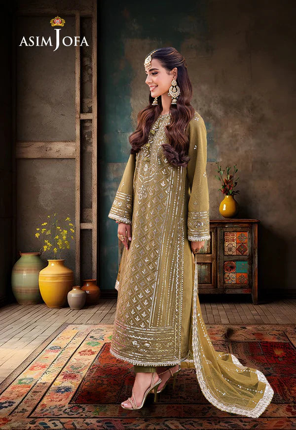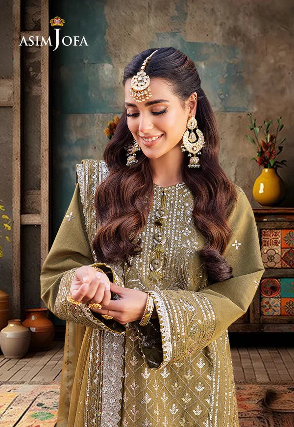 Celebrate the essence of festivity with Asim Jofa’s “Jag Mag Collection”. This outfit is adorned with two-toned gold zari and shimmering light gold sequins and embodies the spirit of joyous celebration. The intricate embroidery creates a mesmerizing pattern exuding timeless elegance. Paired with a matching dupatta that continues the theme of luxurious embroidery, this ensemble ensures you stand out in any crowd. Illuminate every festivity in this radiant outfit that redefines semi-formal wear.
