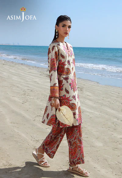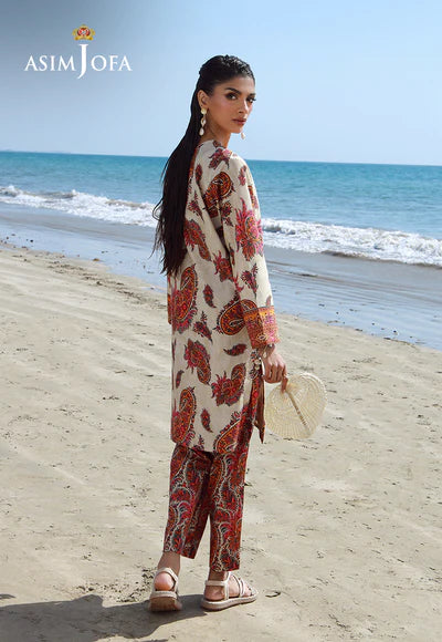 This ensemble features an artful display of paisley motifs, meticulously rendered across the beige shirt. The graceful patterns, dancing across the neutral canvas, make a sophisticated style statement. The contrasting, fully printed trousers add a dazzling and dynamic element to the overall design.