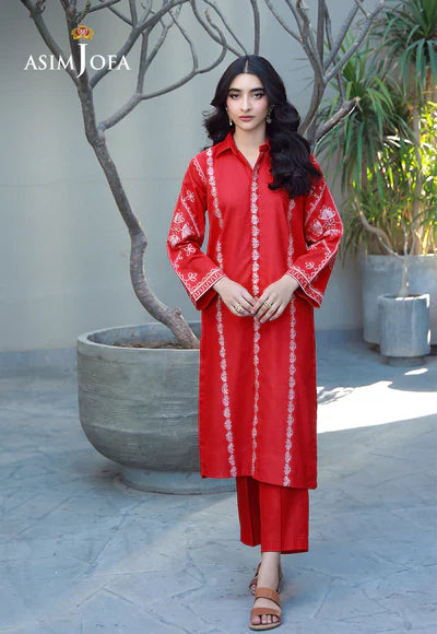 This striking orange ensemble presents a vibrant canvas for exquisite craftsmanship. The shirt, a rich hue of citrus, features meticulously detailed embroidery in a contrasting shade. Beautiful motifs, strategically placed across the sleeves, draw the eye with their intricate design. Paired with elegantly simple plain trousers, the ensemble achieves a harmonious balance of formal and casual chic.