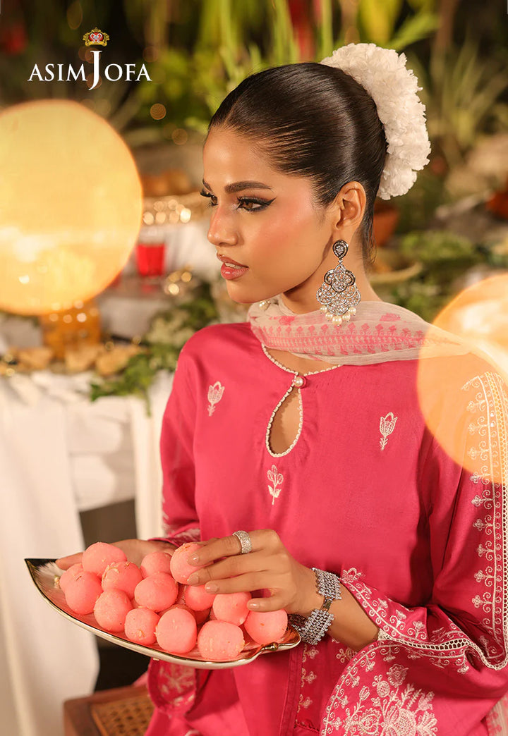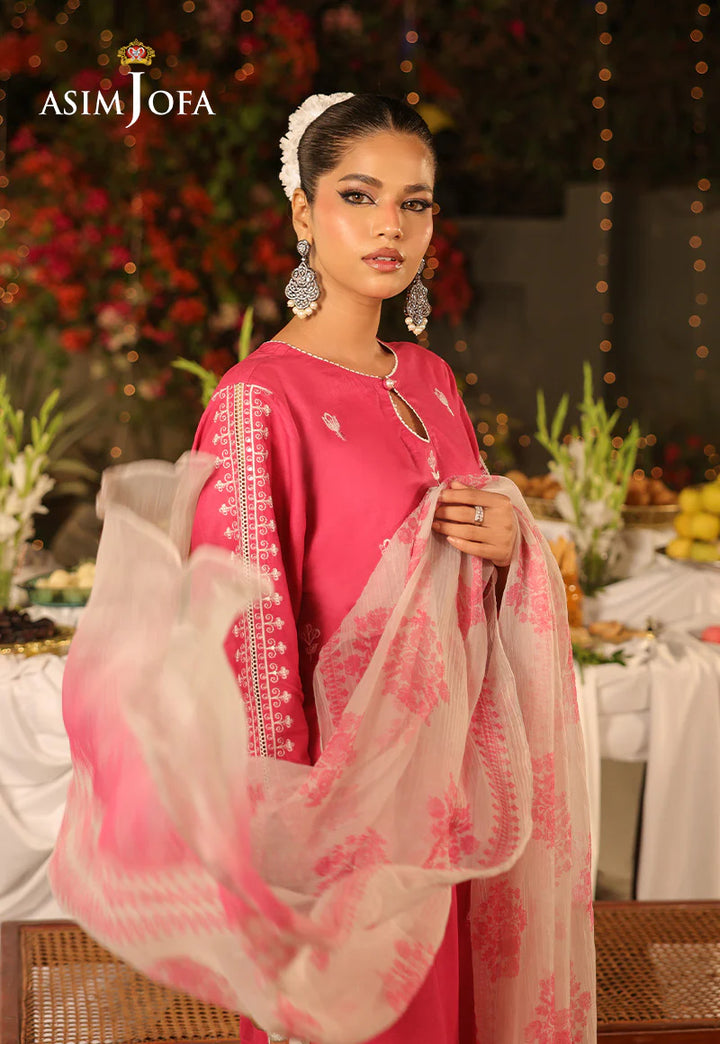 Embrace ethereal charm in this pristine pink ensemble, where elegance meets artistry. The shirt is adorned with intricate ivory threadwork, weaving a mesmerizing play of contrast and detail. Embroidered sleeves add a touch of refined finesse. Paired with a beautifully printed dupatta in a striking contrast, this ensemble radiates effortless allure.