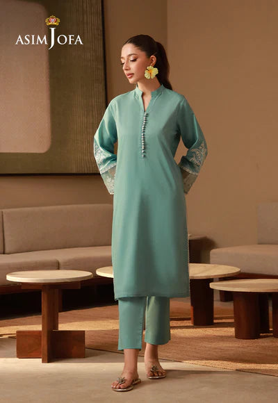 This sea green ensemble is minimalism redefined. The shirt, with its crisp collar neckline and subtle button accents on the front, exudes a sense of understated sophistication. However, the true focal point lies in the sleeves, where stunning embroidery takes center stage, adding a touch of artistic flair. Paired with plain trousers, the outfit exudes modernity.