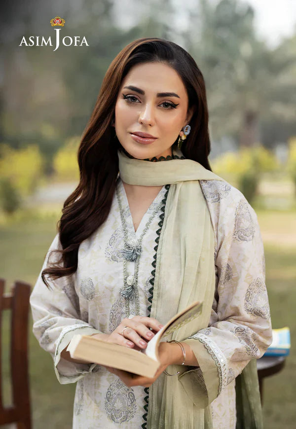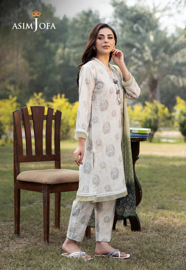 Soft and graceful, this off-white ensemble is a celebration of delicate charm. The printed shirt is adorned with intricate lace detailing along the neckline, sleeves, and border, adding a touch of refinement to its airy design. Paired with matching printed trousers for a cohesive look, the ensemble is completed with a contrasting chiffon dupatta, featuring a mesmerizing ombré effect, adding depth and a striking visual balance. A perfect blend of elegance and ease, this outfit is a timeless addition to any wardrobe.