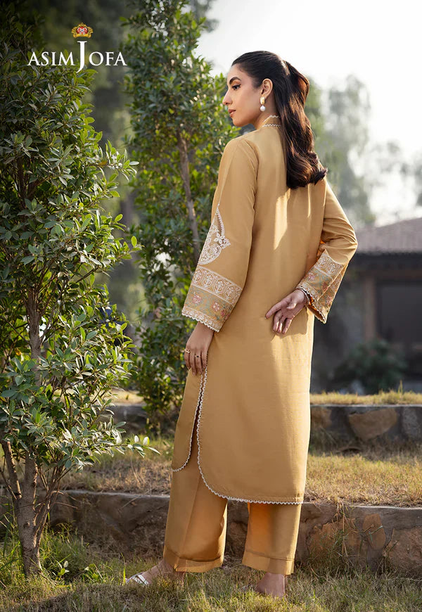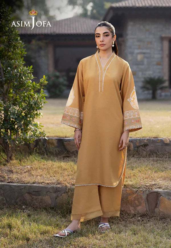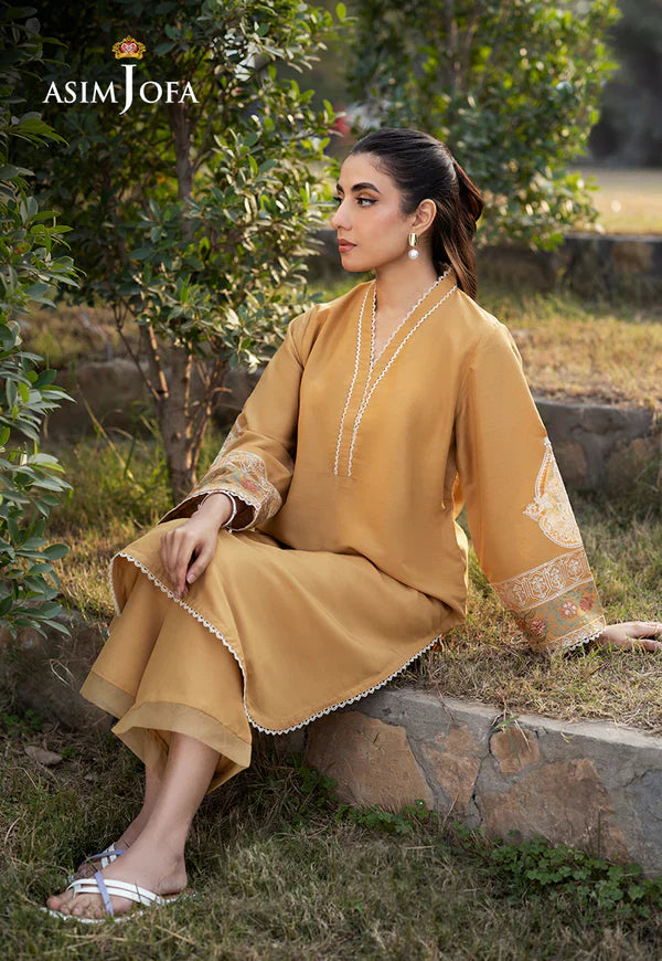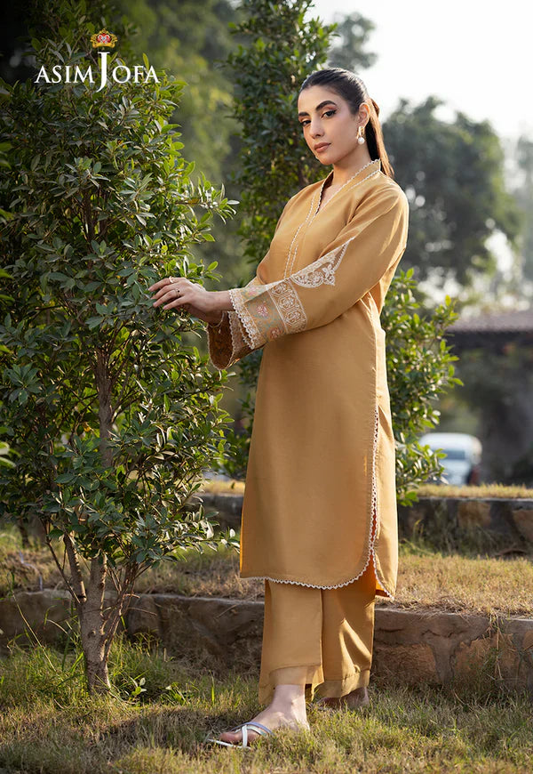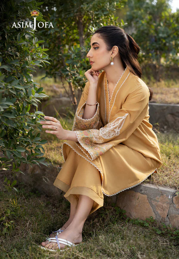 Make a statement with this vibrant dark yellow outfit. The shirt boasts a stunning neckline adorned with delicate lace detailing, while the sleeves are beautifully accented with intricately embroidered motifs and a finely crafted border. Paired with plain trousers, this ensemble is the perfect blend of bold color and elegance.