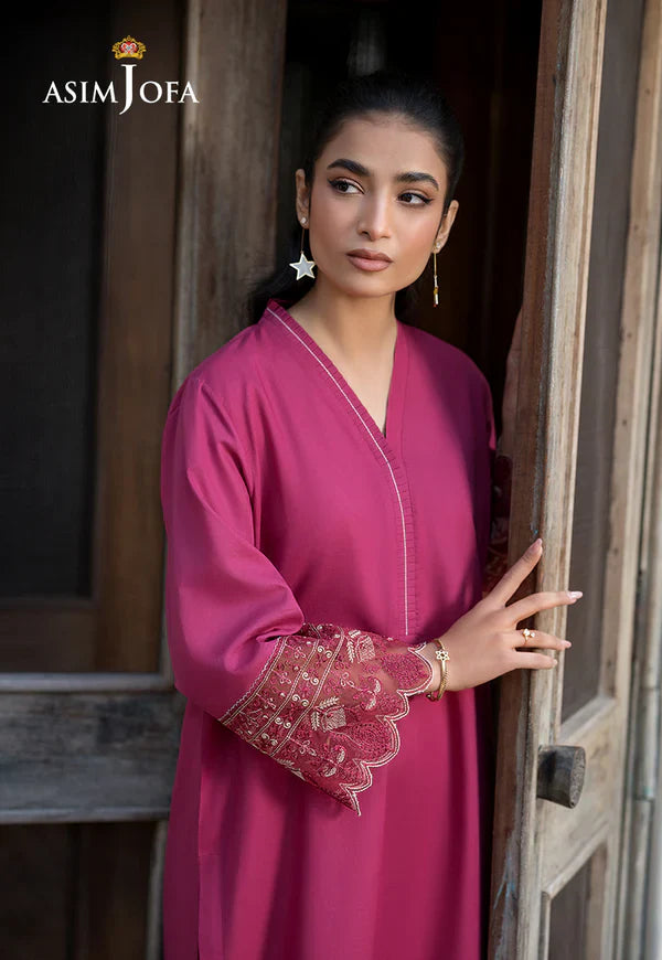 Embrace the allure of minimalism with this magenta-hued shirt. Featuring elegantly embroidered sleeves, a plain bodice with stitching pattern on the hem, and a sleek V-neckline, it’s the perfect piece to pair with your favorite culottes for a chic and effortless look.