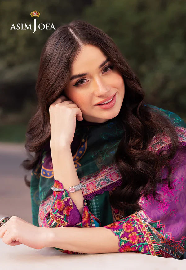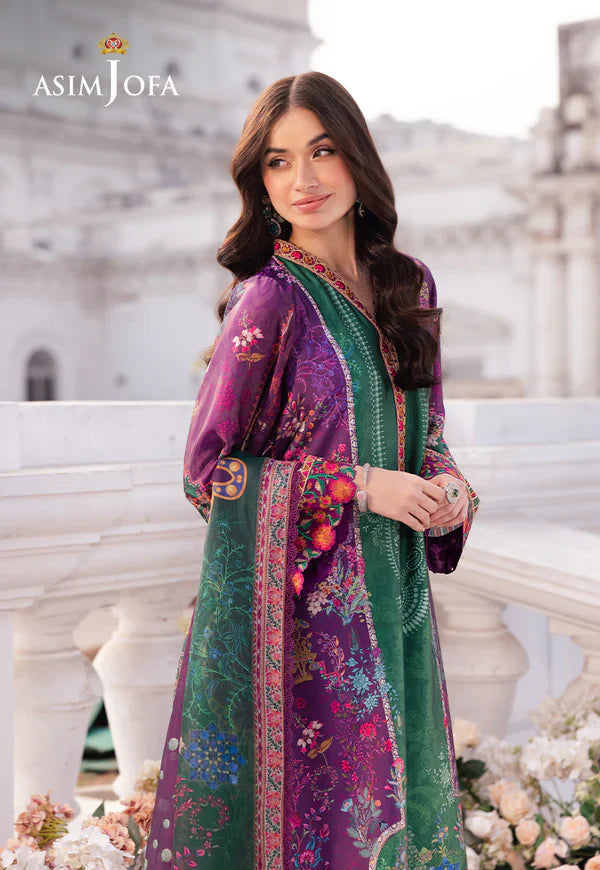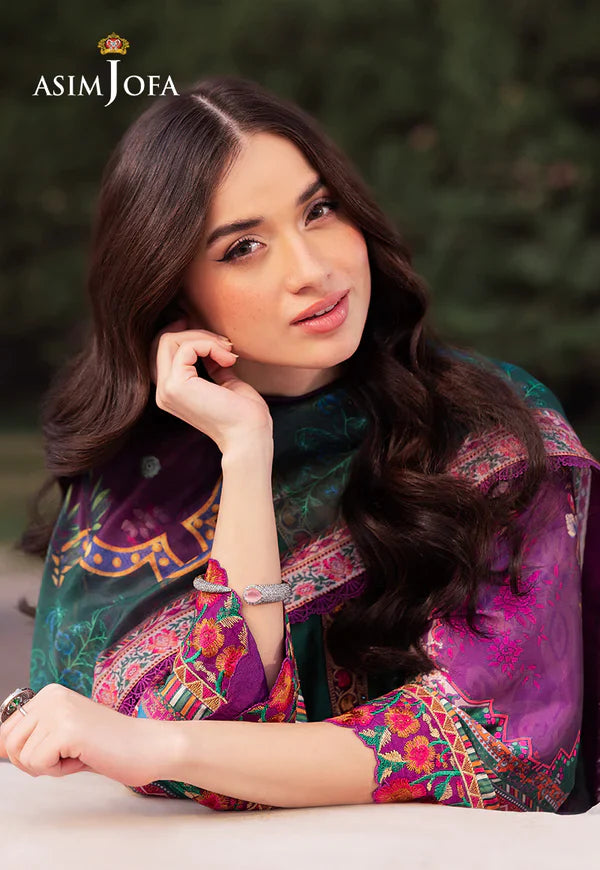 The essence of traditional prints radiates through this striking olive green and magenta ensemble, where unique design bloom like a garden blessed with colors. The digitally printed shirt features a delicately embroidered neckline capturing the heart of floral elegance, while the sleeves and borders, adorned with intricate embroidery, add layers of grandeur. Complemented by a flowing digitally printed silk dupatta that drapes like a poetic breeze, this ensemble effortlessly transitions between formal grace and casual allure, making it a statement of undeniable beauty.