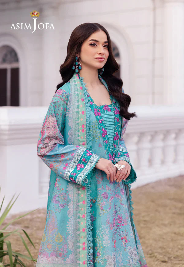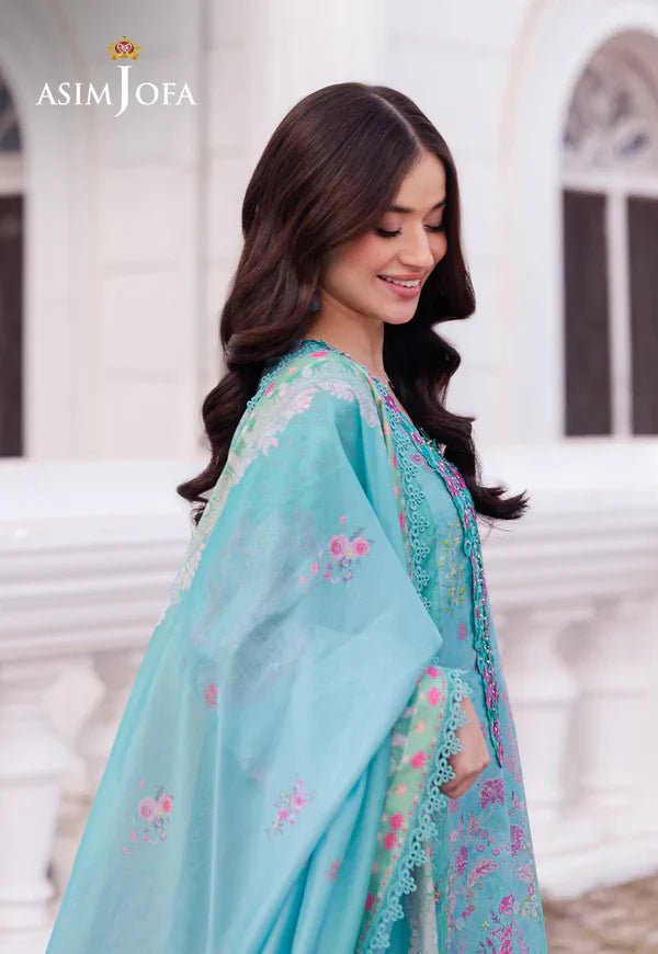 This Aqua Marine ensemble exudes a regal allure, with floral prints flourishing like a lush forest at dusk. The digitally printed aqua marine shirt features a finely embroidered neckline mirroring the intricate beauty of nature, while the embroidered sleeves and borders bring a touch of majestic splendor. Accompanied by a digitally printed silk dupatta that flows like a mint-hued breeze, this outfit is the epitome of gorgeousness, perfect for making a statement at any occasion.