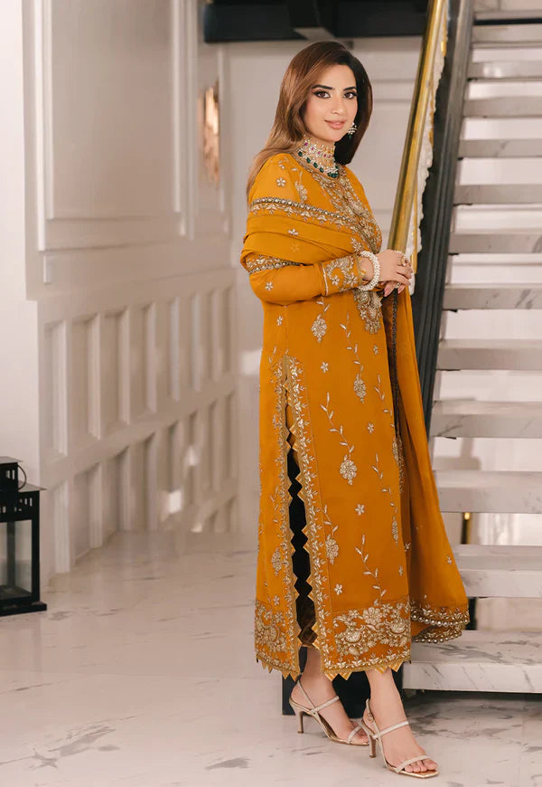 Bask in the golden rays of ‘The Maahru’ with this Marigold yellow ensemble that blooms with intricate floral and branches embroidery, akin to a field of sunflowers in full bloom. Featuring an all-over booti work for the front and back, embroidered sleeves, neckline, and chaak border, this masterpiece is a true ode to nature's splendor. Saboor Aly oozes divine radiance in this ensemble that moves with expressive grace.