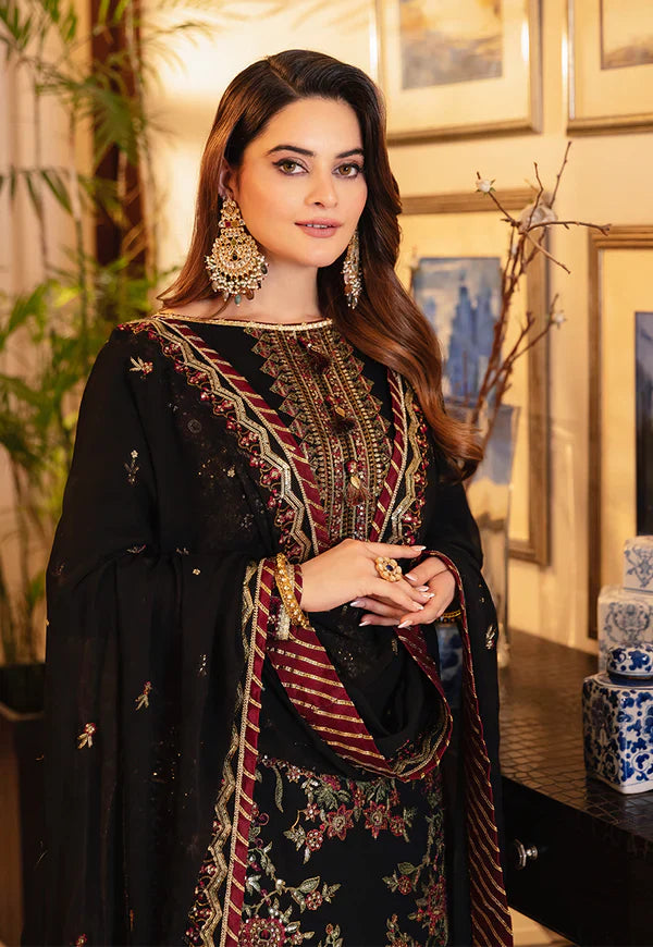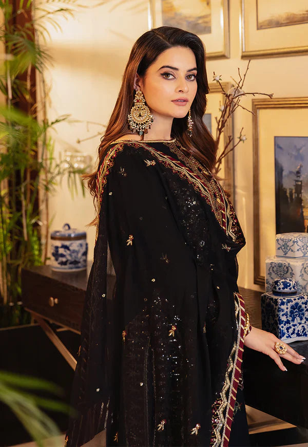 Like a garden at midnight, 'The Noorie' collection blooms with the allure of black and the vibrancy of multi-colored floral embroidery. Minal Khan models the enchanting embodiment of femininity in a poly cotton ensemble with embroidered borders like winding vines and organza bunches like blossoming flowers. It's a bouquet of beauty that will leave onlookers spellbound