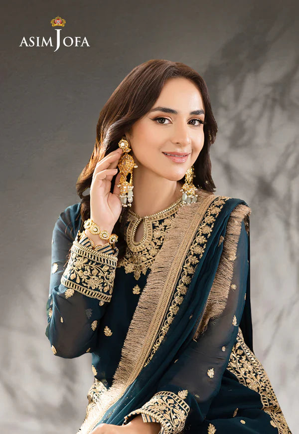 Give yourself a minimalist yet impactful aesthetic with this Essex Green number from ‘The Meerub’ by Asim Jofa. The juxtaposition of chiffon and poly cotton in this ensemble creates a balance of lightness and buoyancy feel. The chiffon dupatta with side borders is the flawless finishing touch. Yumna Zaidi radiates an ethereal aura in this ensemble that is nothing short of a poetic masterpiece in motion.
