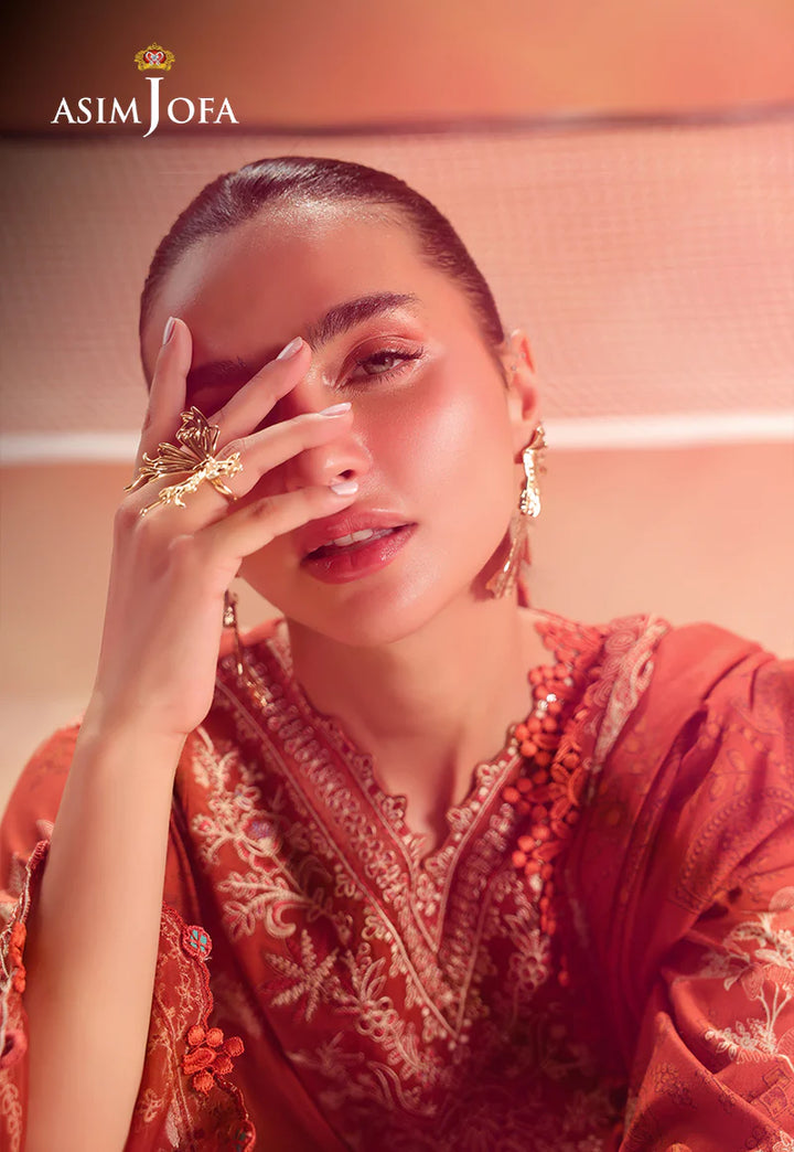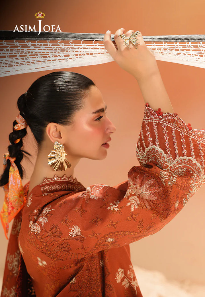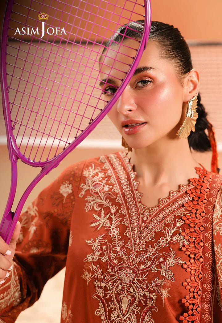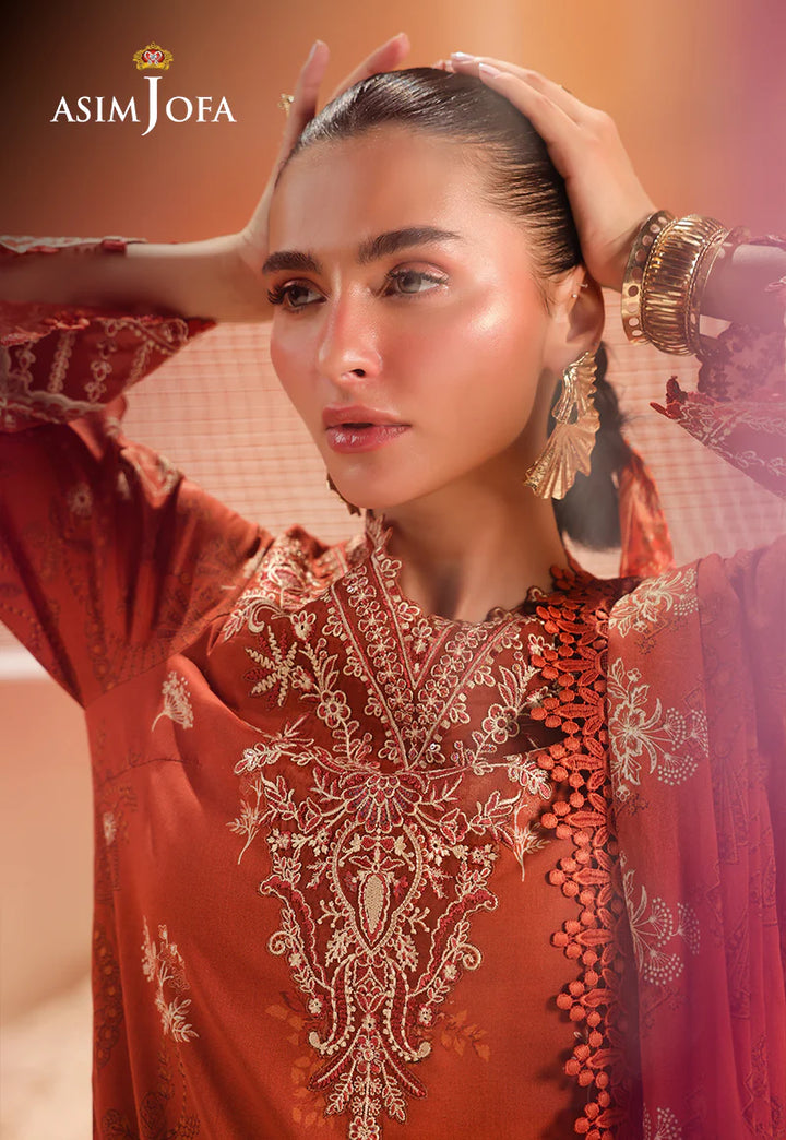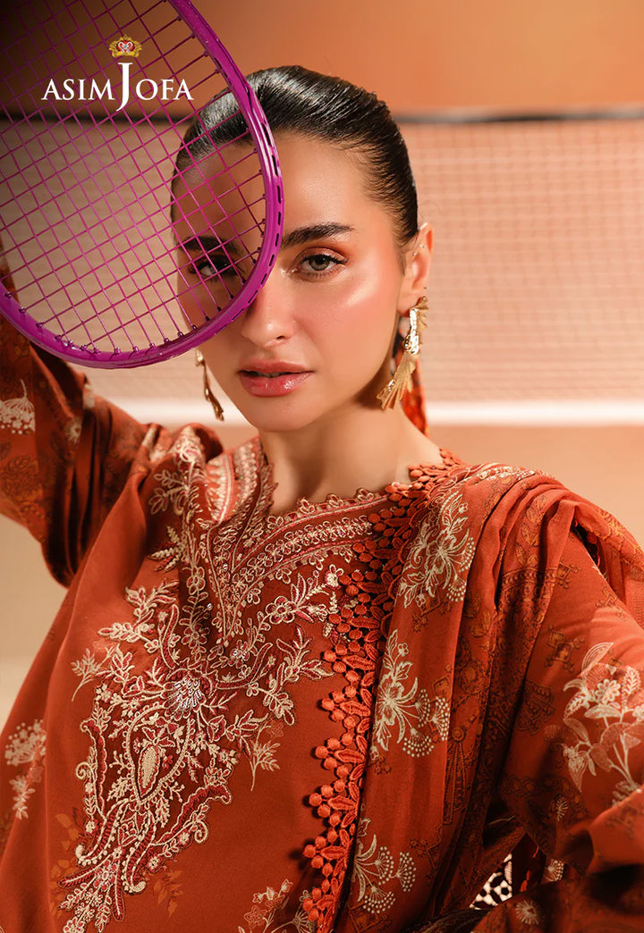 Minimalism meets poetry in this rust-hued vision. The clean yet captivating print forms a backdrop for delicate embroidery on the neckline and sleeves—like sunlight filtering through autumn leaves. A printed dupatta adds a soft finish to this artistic expression.