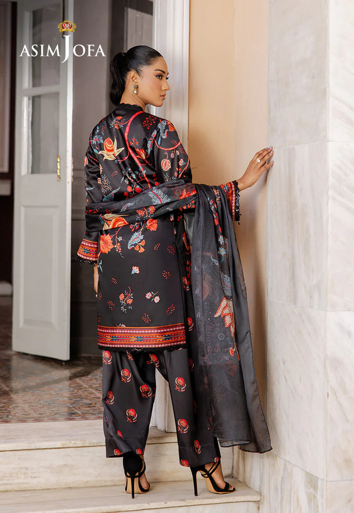 This black ensemble blends sophistication with artistic flair. Crafted from silky fabric, the shirt showcases a gorgeous print that stands out with effortless charm. Complemented by printed trousers and a matching printed dupatta, the outfit offers a cohesive and stylish look—ideal for both casual gatherings and semi-formal occasions.
